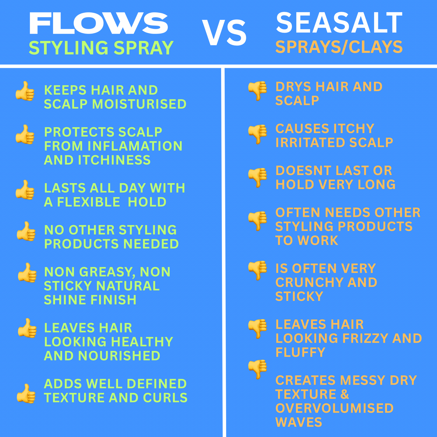 MUCH BETTER THAN ALTERNATIVE SPRAY STYLERS. HAVE TRIED SEASALT SPRAYS AND THEY JUST DRIED OUT MY HAIR AND MADE MY SCALP ITCH. FLOWS SPRAY IS SO MUCH EASIER ON THE SCALP AND ACTUALLY HYDRATES MY HAIR WHILST STYLING IT. DEFFO WOULD RECOMMEND!!